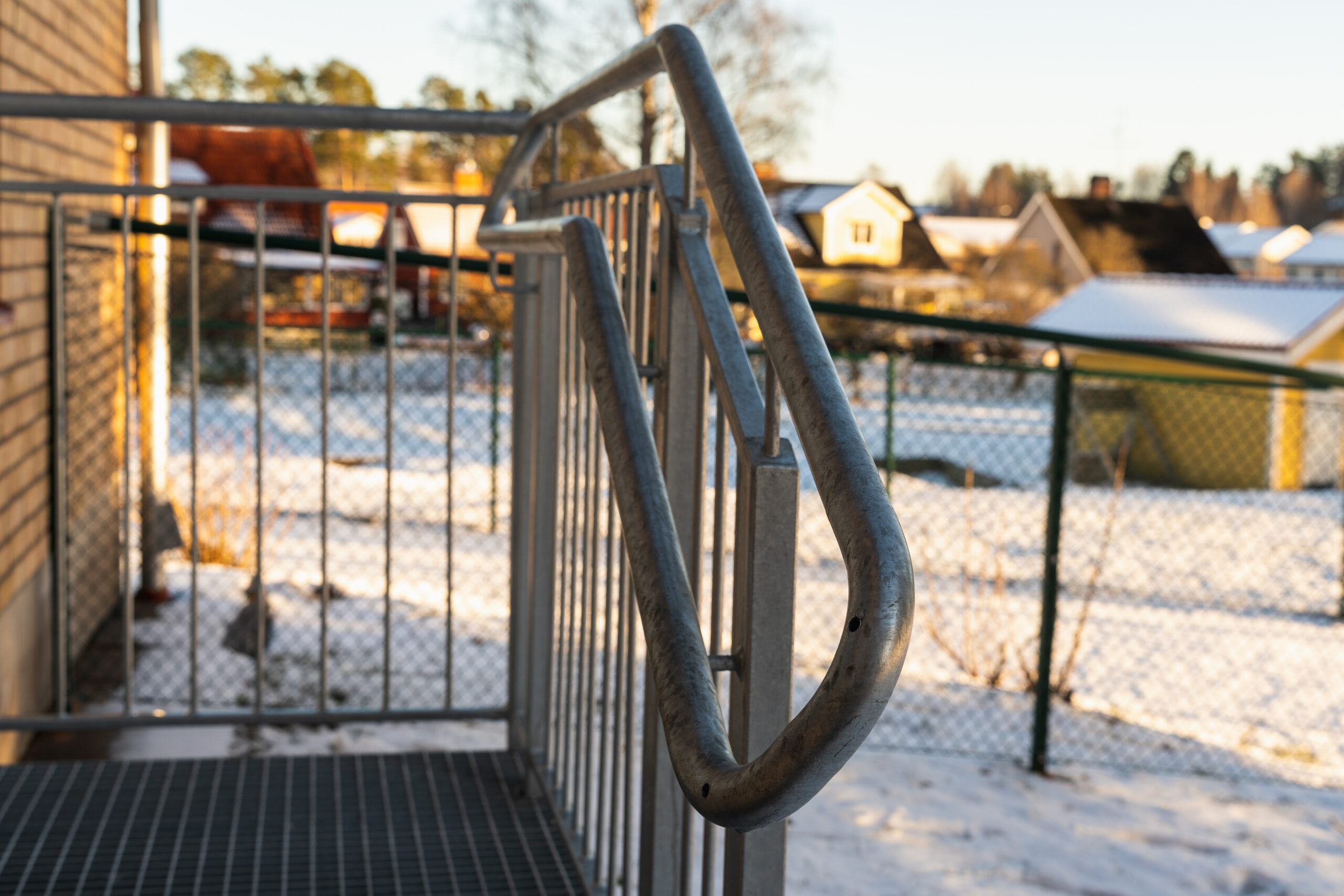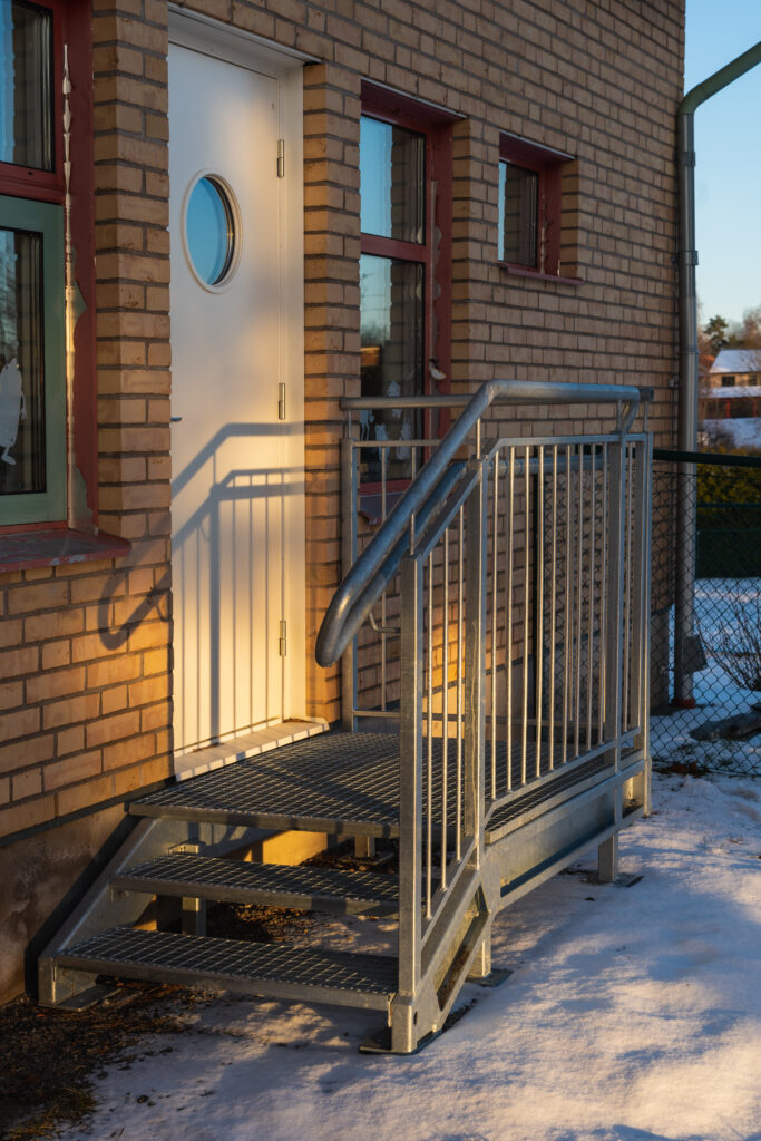 Barnsäker trappa till entré. Steg av gallerdurk SGD3438. Räcke av typen Modern D, dubbel ledstång för enkel tillgång för barn. Levererat i varmfözinkat stål. Till projektet vilket var en renovering levererades även en spiraltrappa för utrymning.